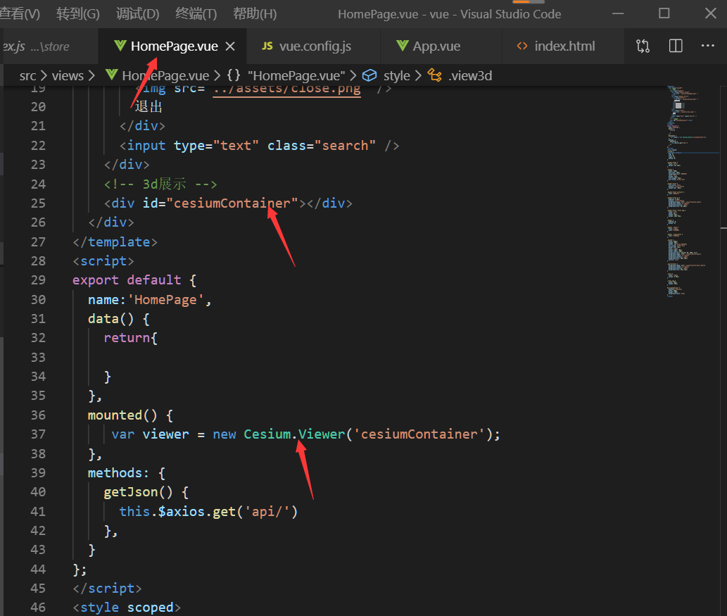 方案一、搭建完vue项目后,直接在public文件中引入cesium文件夹,然后在index.html中引入widgets.css;在body底部引入cesium.js