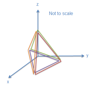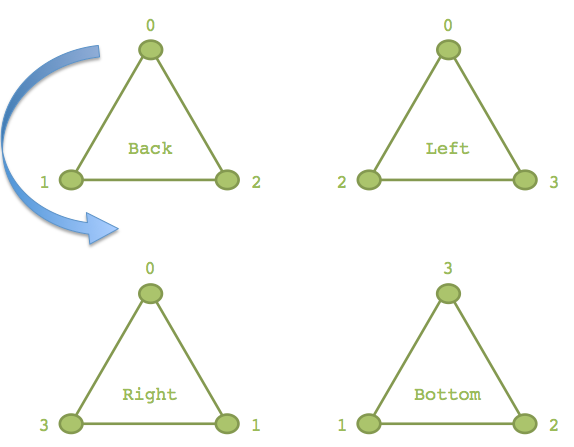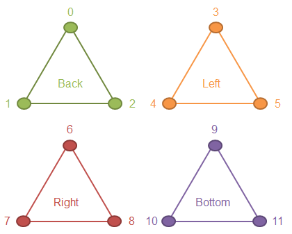 var positions = new Float64Array(4 * 3 * 3); // back triangle positions[0] = 0.0; positions[1] = 0.0; positions[2] = 1.0; positions[3] = 0.0; positions[4] = (2.0 * Math.sqrt(2.0)) / 3.0; positions[5] = negativeOneThird; positions[6] = -rootSixOverThree; positions[7] = negativeRootTwoOverThree; positions[8] = negativeOneThird; // left triangle positions[9] = 0.0; positions[10] = 0.0; positions[11] = 1.0; positions[12] = -rootSixOverThree; positions[13] = negativeRootTwoOverThree; positions[14] = negativeOneThird; positions[15] = rootSixOverThree; positions[16] = negativeRootTwoOverThree; positions[17] = negativeOneThird; // right triangle positions[18] = 0.0; positions[19] = 0.0; positions[20] = 1.0; positions[21] = rootSixOverThree; positions[22] = negativeRootTwoOverThree; positions[23] = negativeOneThird; positions[24] = 0.0; positions[25] = (2.0 * Math.sqrt(2.0)) / 3.0; positions[26] = negativeOneThird; // bottom triangle positions[27] = -rootSixOverThree; positions[28] = negativeRootTwoOverThree; positions[29] = negativeOneThird; positions[30] = 0.0; positions[31] = (2.0 * Math.sqrt(2.0)) / 3.0; positions[32] = negativeOneThird; positions[33] = rootSixOverThree; positions[34] = negativeRootTwoOverThree; positions[35] = negativeOneThird; var indices = new Uint16Array(4 * 3); // back triangle indices[0] = 0; indices[1] = 1; indices[2] = 2; // left triangle indices[3] = 3; indices[4] = 4; indices[5] = 5; // right triangle indices[6] = 6; indices[7] = 7; indices[8] = 8; // bottom triangle indices[9] = 9; indices[10] = 10; indices[11] = 11;