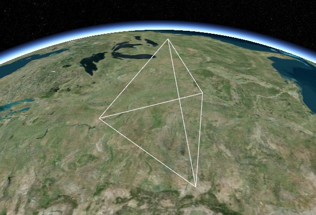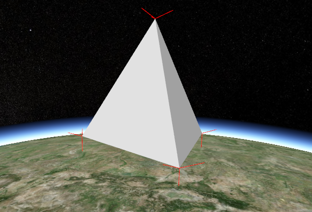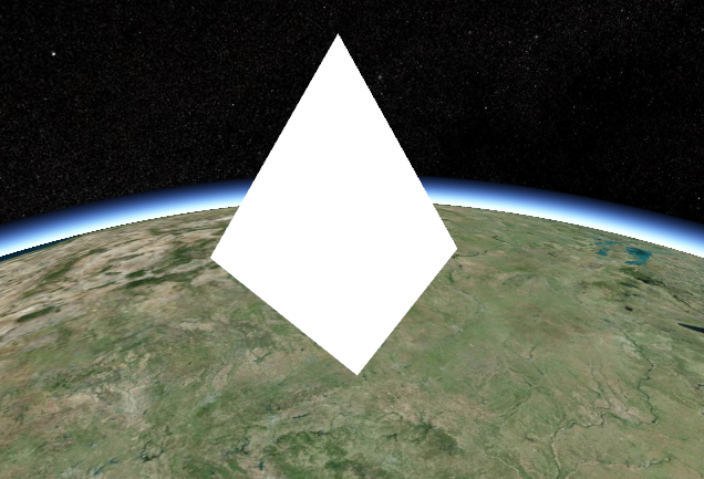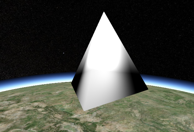 var widget = new Cesium.CesiumWidget('cesiumContainer'); var scene = widget.scene; var ellipsoid = widget.centralBody.ellipsoid; var modelMatrix = Cesium.Matrix4.multiplyByUniformScale( Cesium.Matrix4.multiplyByTranslation( Cesium.Transforms.eastNorthUpToFixedFrame(ellipsoid.cartographicToCartesian( Cesium.Cartographic.fromDegrees(-100.0, 40.0))), new Cesium.Cartesian3(0.0, 0.0, 200000.0)), 500000.0); var instance = new Cesium.GeometryInstance({ geometry : new Cesium.TetrahedronGeometry(), modelMatrix : modelMatrix, attributes : { color : Cesium.ColorGeometryInstanceAttribute.fromColor(Cesium.Color.WHITE) } }); scene.primitives.add(new Cesium.Primitive({ geometryInstances : instance, appearance : new Cesium.PerInstanceColorAppearance({ flat : true, translucent : false }) }));