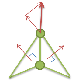 In our case, we need to compute the normals for each vertex to determine the shading of the geometry. The normal to a vertex is a vector in the direction of the sum of the normals for each triangle the vertex composes and with a magnitude of 1. Below shows how we can add the normals of
