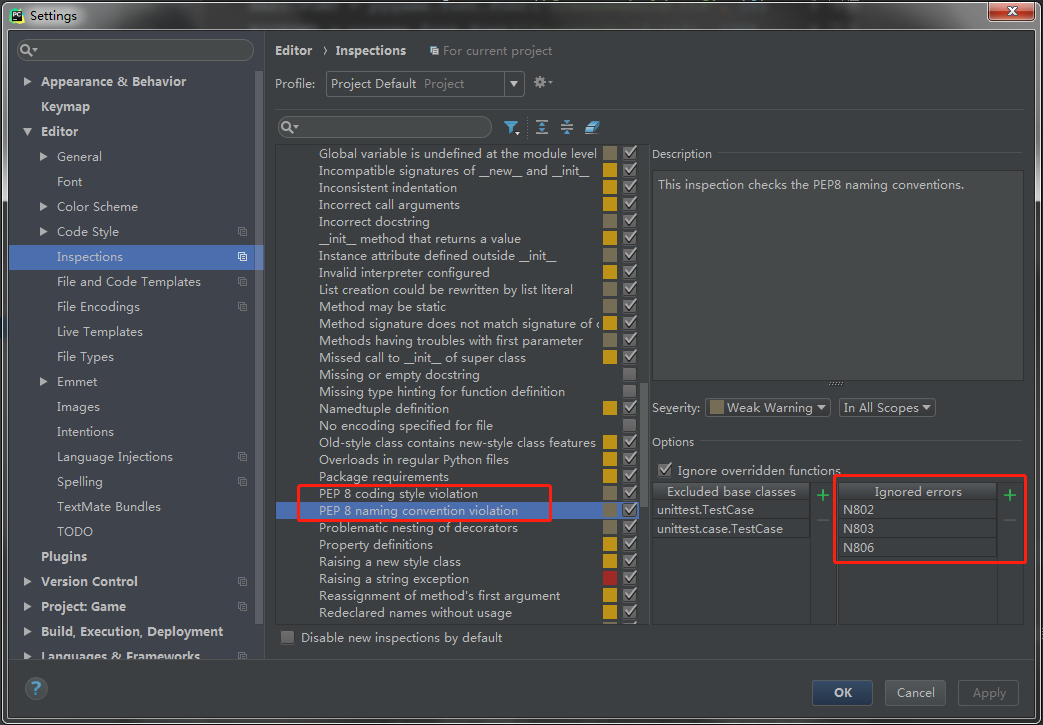 File -> Settings -> Editor -> Inspections -> 右侧Python