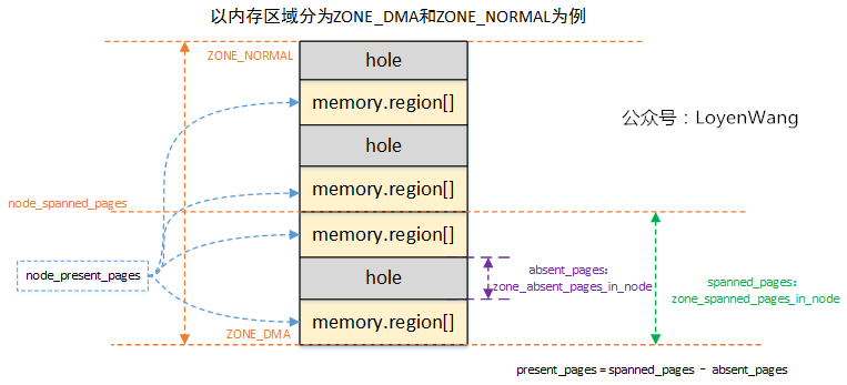 ZONE区域,分别会去统计跨越的page frame,以及可能存在的空洞,并计算实际可用的页面present_pages; Node管理各个ZONE,它的spanned_pages和present_pages是统计各个ZONE相应页面之和。