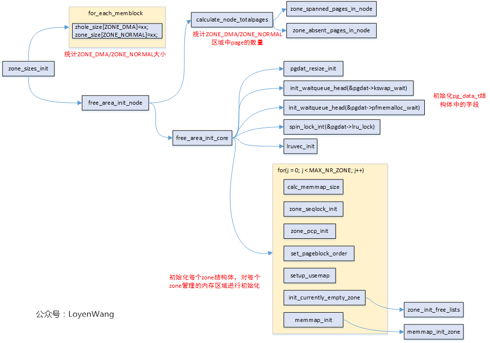 在Linux中,物理内存地址区域采用zone来管理。不打算来太多前戏了,先上一张zone_sizes_init的函数调用图吧: