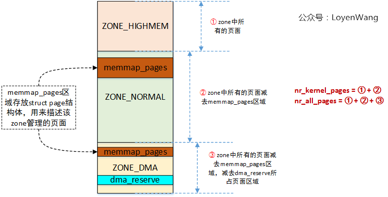 nr_kernel_pages和nr_all_pages的数量,为了说明这两个参数和页面的关系,来一张图(由于我使用的平台只有一个ZONE_DMA区域,且ARM64没有ZONE_HIGHMEM区域,不具备典型性,故以ARM32为例):