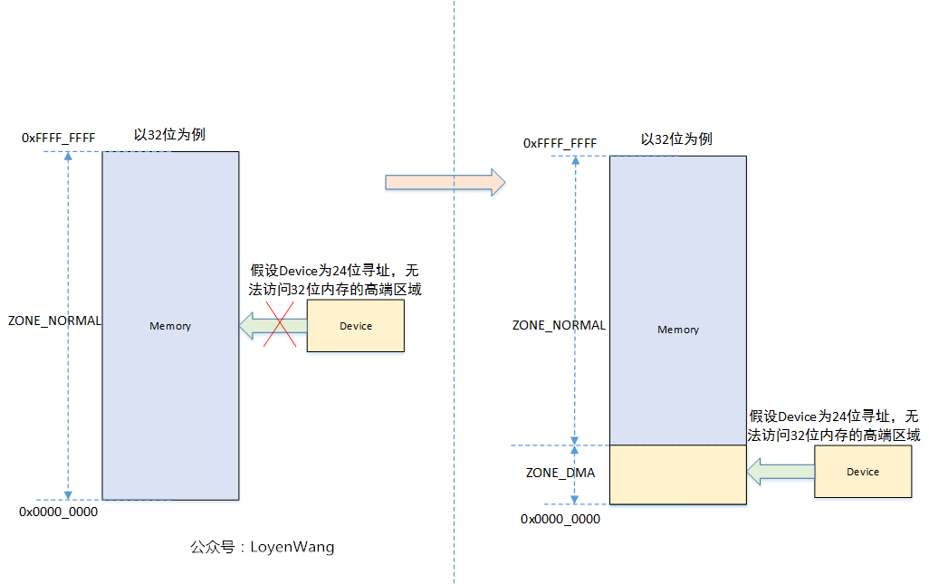 从上述结构体中可以看到,ZONE_DMA是由宏定义的,ZONE_NORMAL才是所有架构都有的区域,那么为什么需要一个ZONE_DMA区域内,来张图: