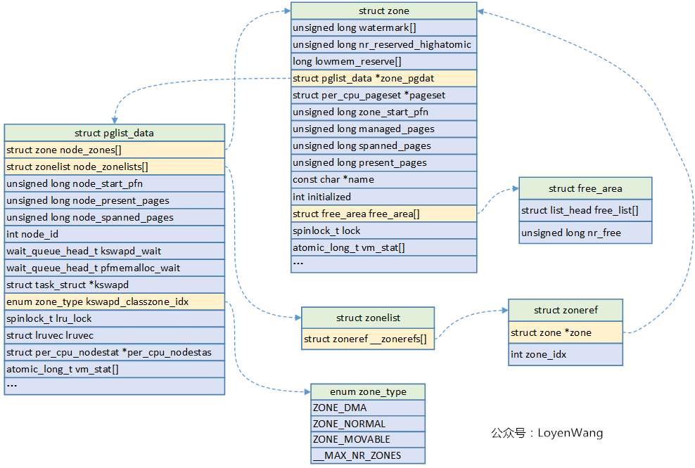 关键的结构体如上图所示。 在NUMA架构下,每一个Node都会对应一个struct pglist_data,在UMA架构中只会使用唯一的一个struct pglist_data结构,比如我们在ARM64 UMA中使用的全局变量struct pglist_data __refdata contig_page_data。
