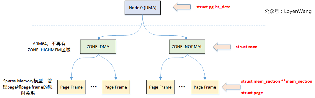 宏观点的描述:struct pglist_data描述单个Node的内存(UMA架构中的所有内存),然后内存又分成不同的zone区域,zone描述区域内的不同页面,包括空闲页面,Buddy System管理的页面等。