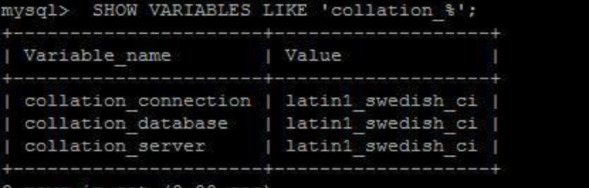 接下来遇到的问题是容器mysql的中文乱码问题。 https://blog.csdn.net/m0_37639542/article/details/72852875这一篇讲的很详细。 简单列举一下步骤: 1.docker exec -ti xxx(容器id) /bin/bash #进入容器 2.mysql -u root -p #进入mysql 3.mysql>SHOW VARIABLES LIKE 'character_set_%';//查看数据库字符集 基本上都如图所示:默认就是瑞典latin1