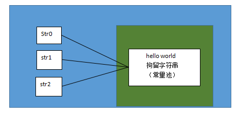 现在有这三个代码,此时堆中有四个值为“hello world”的字符串对象,一个在常量池中,还有三个对象是指向常量池中的字符串。
