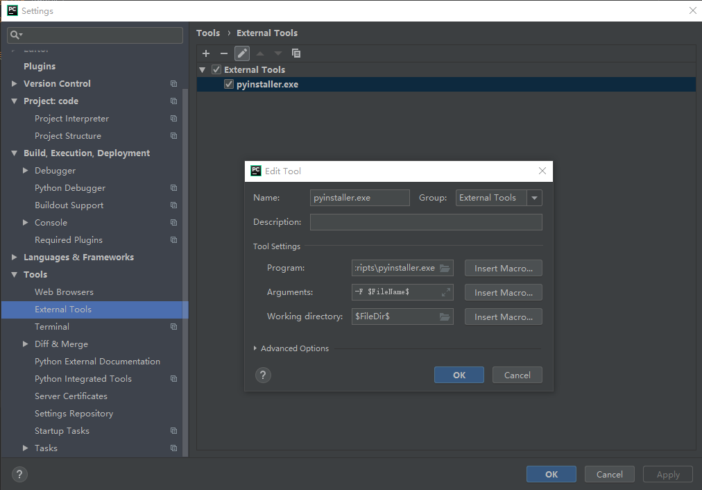 点击Tools -> External Tools -> pyinstaller.exe运行spec文件,等个几分钟后就能在工程下的dist文件夹下找到打包的EXE,足足有300M。