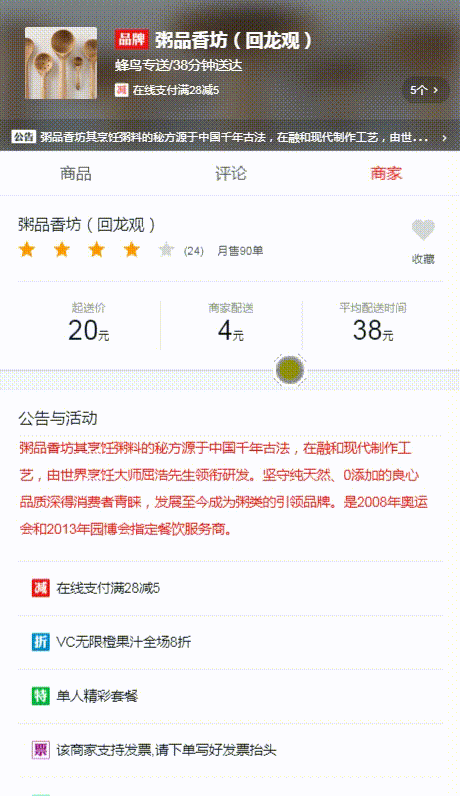View Code<div class="overview"> <h1 class="title">{{seller.name}}</h1> <div class="desc border-1px"> <star :size="36" :score="seller.score"></star> <span class="text">({{seller.ratingCount}})</span> <span class="text">月售{{seller.sellCount}}单</span> </div> <ul class="remark"> <li class="block"> <h2>起送价</h2> <div class="content"> <span class="stress">{{seller.minPrice}}</span>元 </div> </li> <li class="block"> <h2>商家配送</h2> <div class="content"> <span class="stress">{{seller.deliveryPrice}}</span>元 </div> </li> <li class="block"> <h2>平均配送时间</h2> <div class="content"> <span class="stress">{{seller.deliveryTime}}</span>元 </div> </li> </ul> <div class="favorite" @click="toggleFavorite($event)"> <i class="icon-favorite" :class="{'active':favorite}"></i> <!-- 对应是否收藏两种样式--> <span>{{favoriteText}}</span> <!-- 有没有选中对应不同的文本,所以这里要绑定一个变量,放到data中 --> </div> </div> -