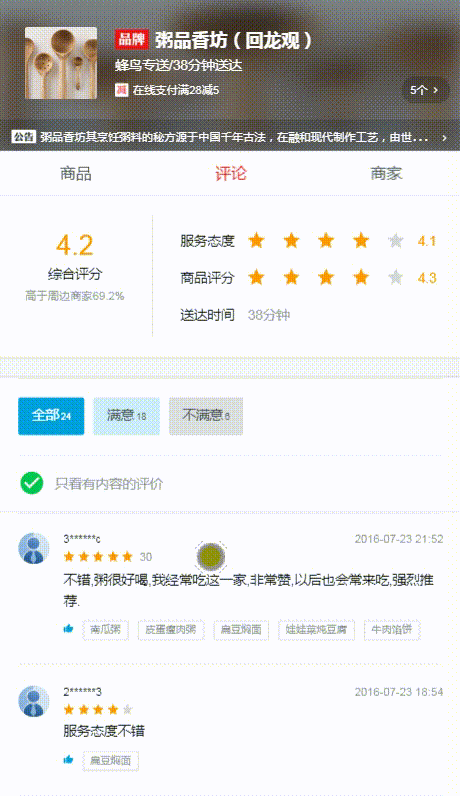View Code<div class="rating-wrapper"> <ul> <li v-for="rating in ratings" :key="rating.id" class="rating-item" v-show="needShow(rating.rateType, rating.text)"> <div class="avatar"> <img :src="rating.avatar" width="28px" height="28px"> </div> <div class="content"> <h1 class="name">{{rating.username}}</h1> <div class="star-wrapper"> <star :size="24" :score="rating.score"></star> <span class="delivery" v-show="rating.deliveryTime"> {{rating.deliveryTime}} </span> </div> <p class="text">{{rating.text}}</p> <div class="recommend" v-show="rating.recommend && rating.recommend.length"> <!-- 赞或踩和相关推荐 --> <i class="icon-thumb_up"></i> <span class="item" v-for="item in rating.recommend" :key="item.id">{{item}}</span> </div> <div class="time"> {{rating.rateTime | formatDate}} </div> </div> </li> </ul> </div> -
