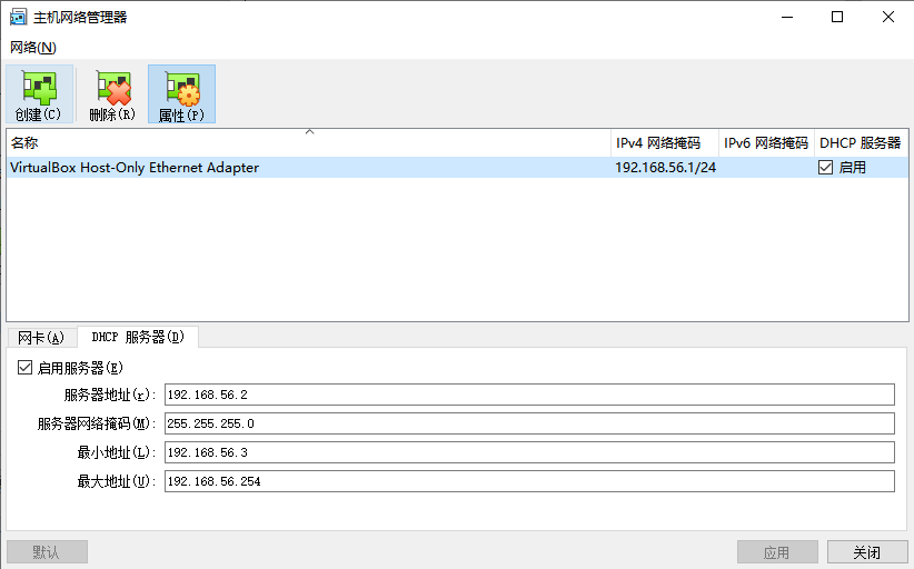 打开 virtualBox - 管理 - 主机网络管理器,点击创建(仅主机网络Host-only),点击手动配置网卡,启用DHCP