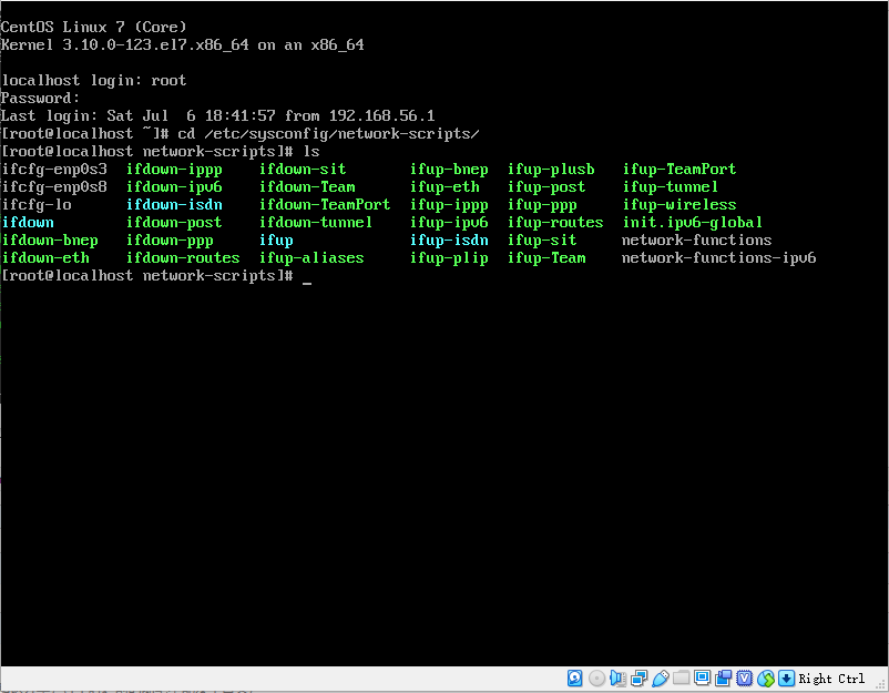 开机,进入 /etc/etc/sysconfig/network-scripts/目录,可以看到目前只有ifcfg-enp0s3和ifcfg-enp0s8配置文件(如果安装centos7没有选择两个网卡的话,应该只有ifcfg-enp0s3 一个配置文件,如果只有一个配置文件,则另外一个就用这个copy过来改,需要更改UUID的值),如下图: