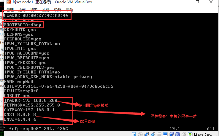 注意看,是否已经将ONBOOT=no改为yes(最开始默认为NO,yes意思是,“BOOT开机”时候就能使用这张网卡),再添加BOOTPROTO为dhcp(只有“静态static”和“动态dhcp”两种方式),保存,退出,重启网络。