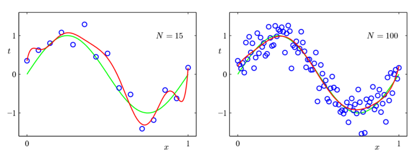 对于M=9的多项式,M=15(左图),M=100(右图)通过最小化平方和误差函数得到的解,显示,训练集的增大可以减小过拟合的问题。