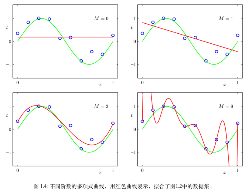 选择阶数M也是一个问题,这个问题叫模型选择。当M=0,1时,模型过于简单,多项式对数据的拟合效果较差,很难表示模型