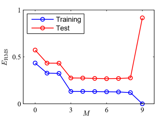 当M取不同的值时,训练误差与测试误差如下图所示,由下图可值,当M=3,4,5,6,7,8时,模型具有很好的泛化能力。