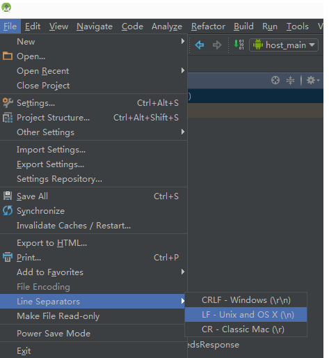 2.配置IDE开发环境,将它的换行格式指定为LF,以android studio为例: