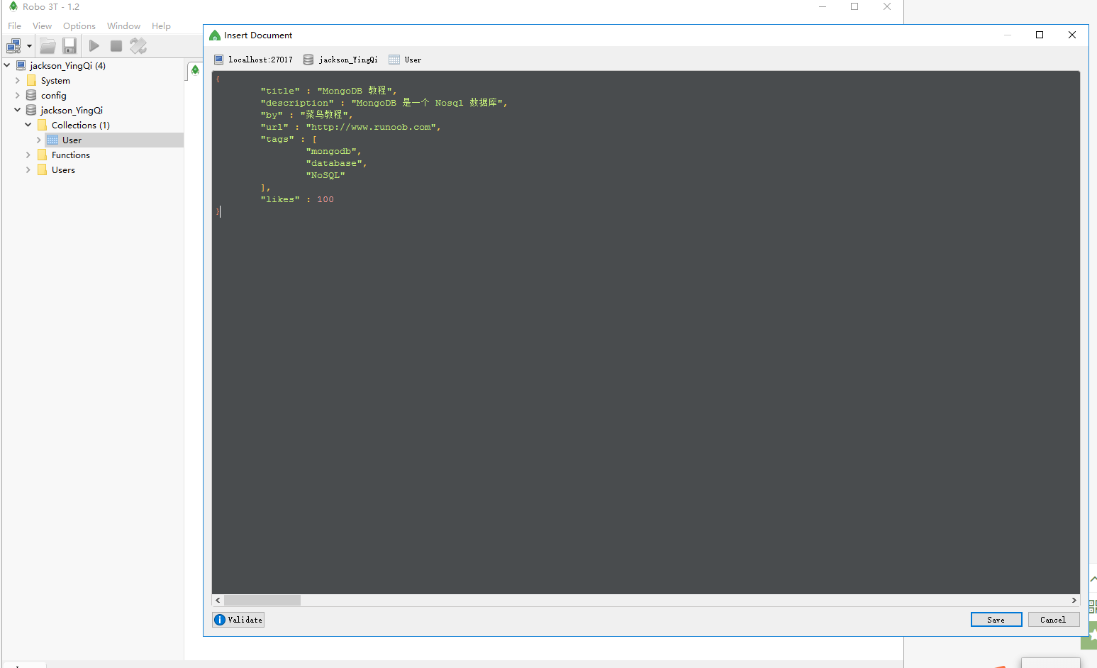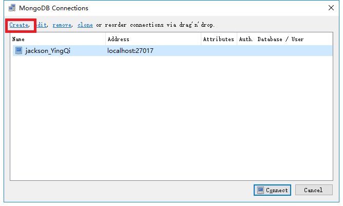 1,打开Robo 3T ,点击“create”创建一个到mongoDB的连接。