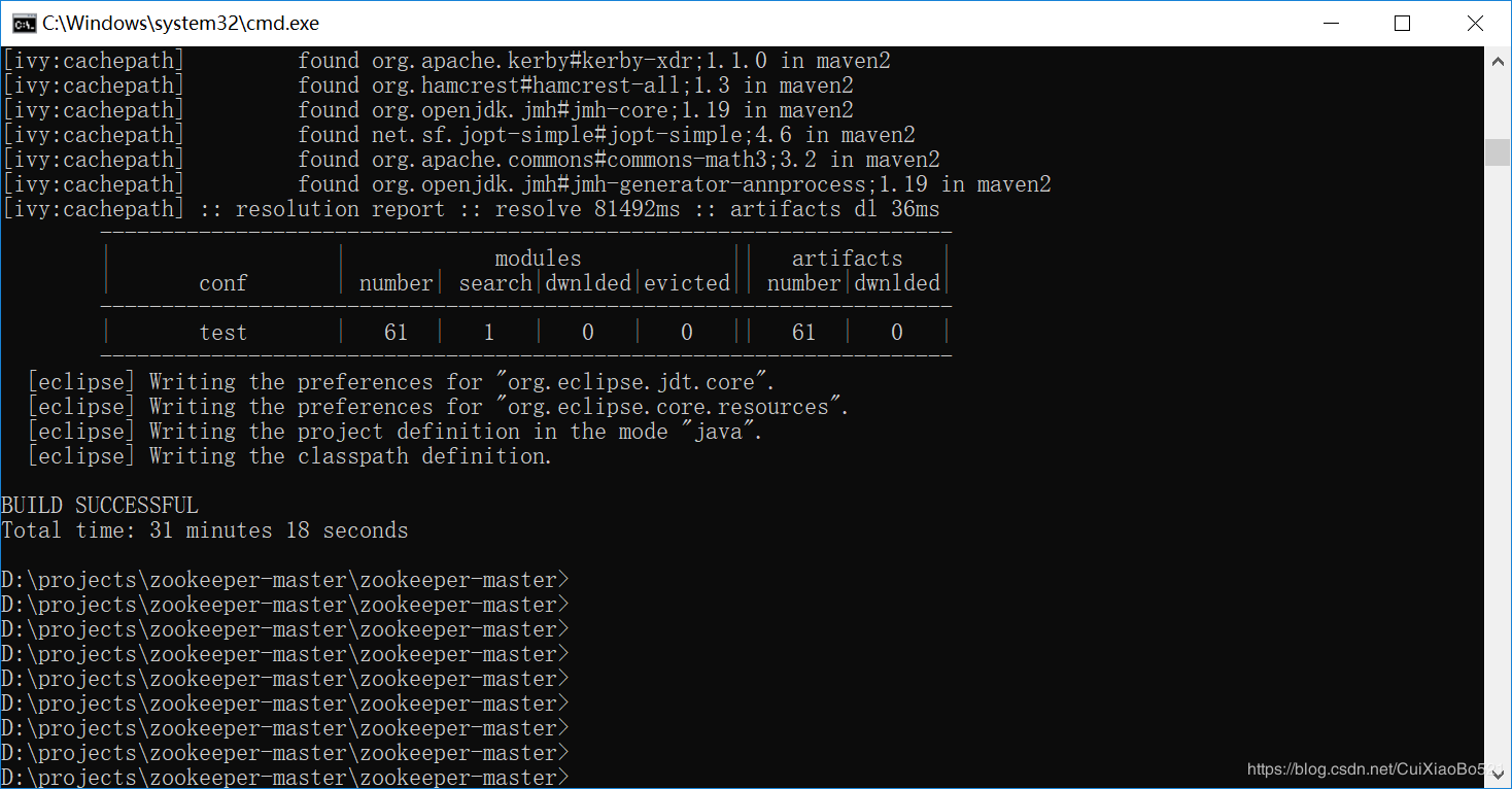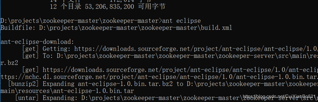 打开cmd,切换到Zookeeper的解压目录下,即build.xml的当前目录下。用ant eclipse命令进行编译。