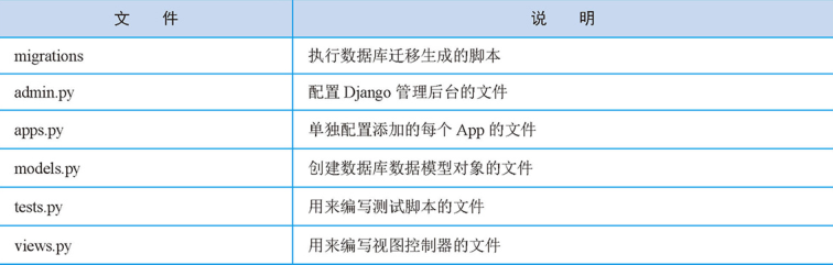 在Django项目中,推荐使用APP来完成不能模块的任务执行 :python manage.py startapp 应用名即可新建一个应用,目录如下。