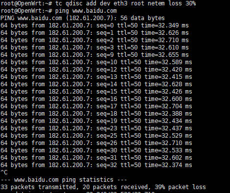 增加eth3网卡随机丢包30%,pingbaidu看下效果: