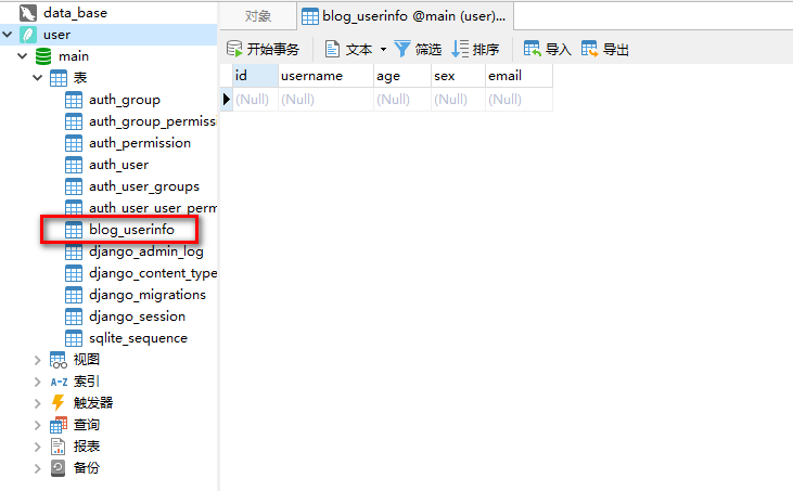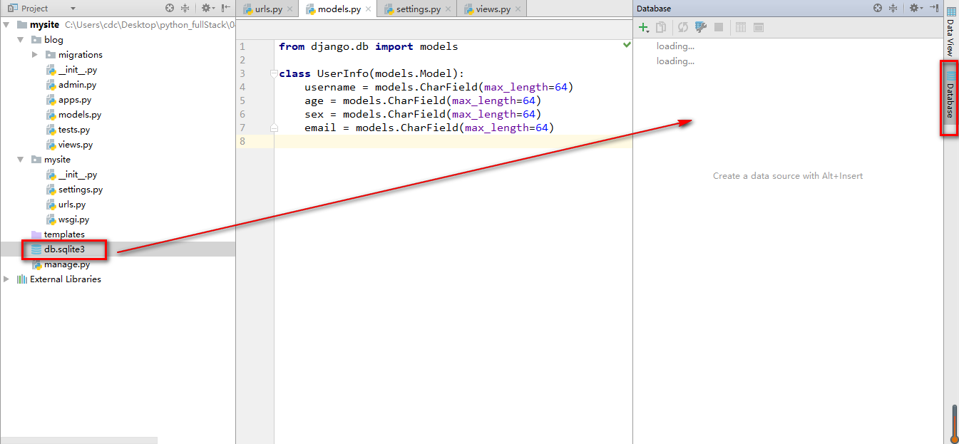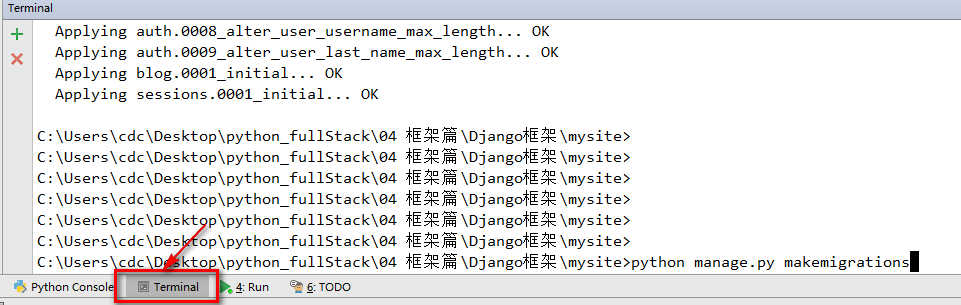 Django框架默认带的是sqlite3数据库,要使用其他数据库时需要在settings.py中修改。本次案例中使用默认的数据库。在终端输入以下命令生成数据库,并将数据库直接拖拽到pycharm数据库操作栏,可以直接看到数据库结构和表信息(由于习惯问题,本人使用的是Navicat操作数据库):
