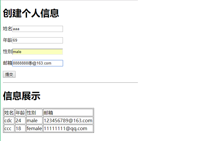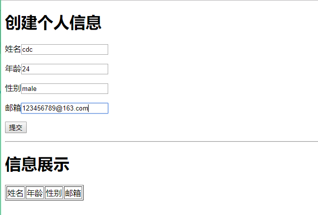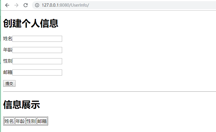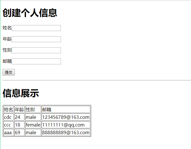通过简单写一个网页,让用户可以提交自己的姓名、年龄、性别、邮箱地址等信息,将用户信息存入数据库中,并在当前页面展示出来。