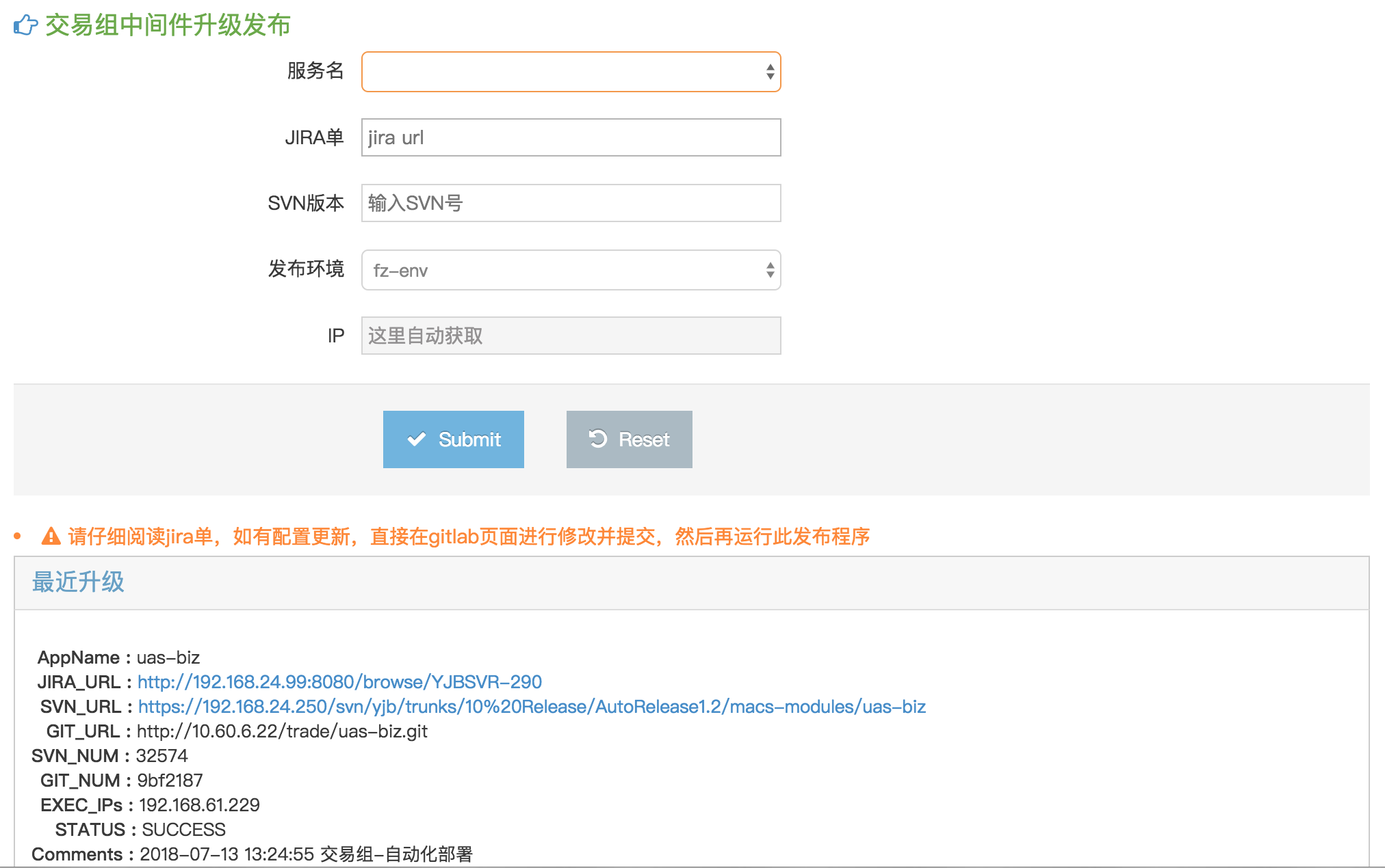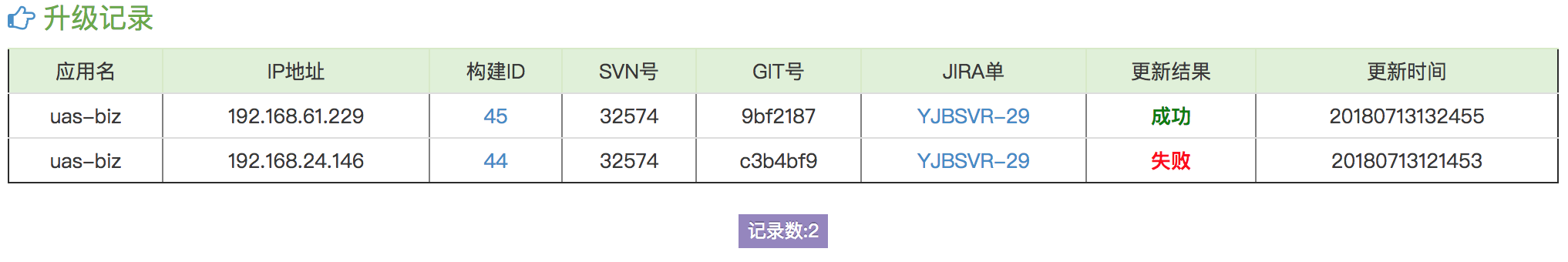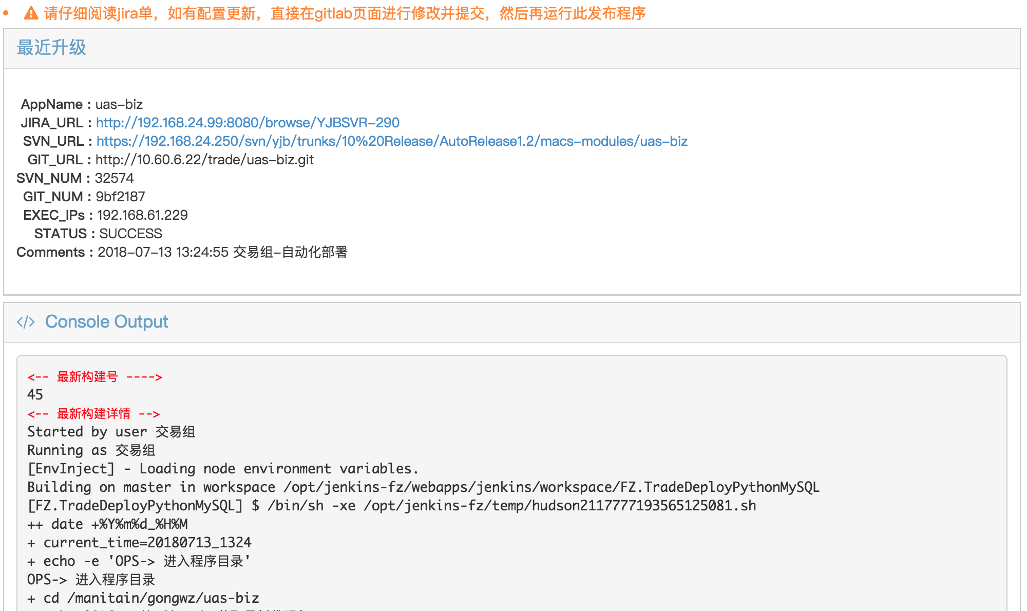 在按下提交按钮后后端开始执行发布程序(jenkins),执行完成之后(成功/失败)返回如下结果