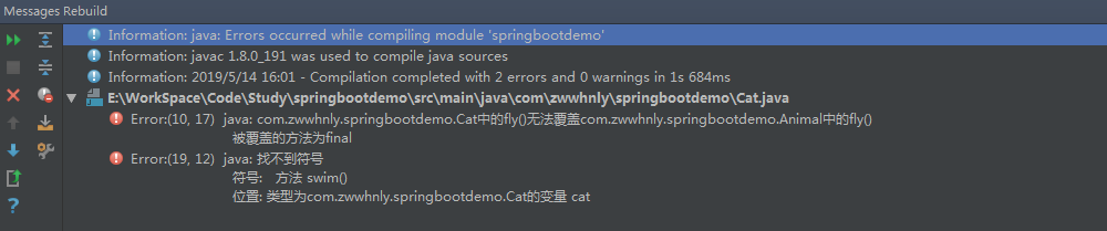 1)当我们重写fly()方法时,因为父类的fly()方法被定义为final方法,重写时会编译错误