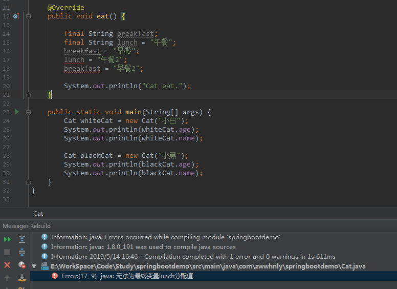 我们修改下1.2中的Cat类代码,定义2个final成员变量,1个声明完立即赋值,1个在构造函数中赋值: