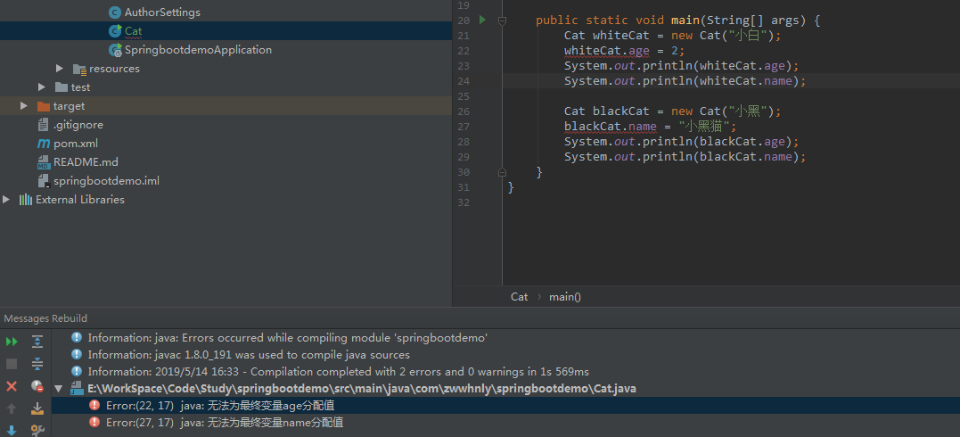 以上代码有2个编译错误,1个是whiteCat.age = 2;修改成员变量age时,另1个是blackCat.name = "小黑猫";修改成员变量name时,都提示不能修改final成员变量。
