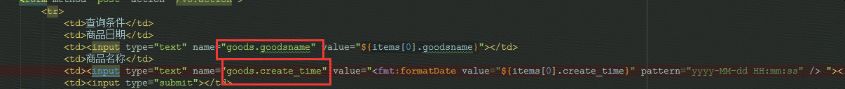 28 <td><input type="text" name="goods.create_time" value="<fmt:formatDate value="${items[0].create_time}" pattern="yyyy-MM-dd HH:mm:ss" /> "></td>