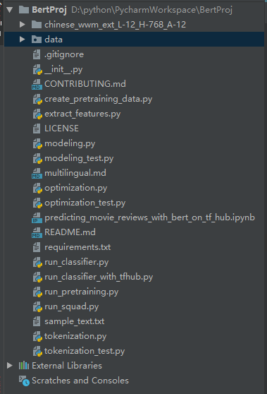 可以看到run_classifier.py文件,这个是我们需要用的。另外,chinese开头的文件是我们的模型地址,data文件是我们的数据地址,这个每个人可以自己设置。