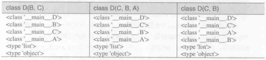 当遍历的过程结束后,D的mro列表也就存储了一个class对象的顺序列表了。从上面的遍历过程可以看到,这个列表是(D、C、A、B、list、object),我们可以来验证一下: