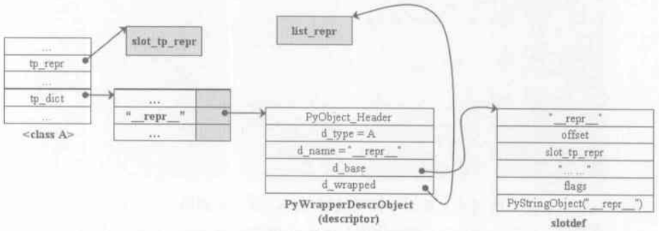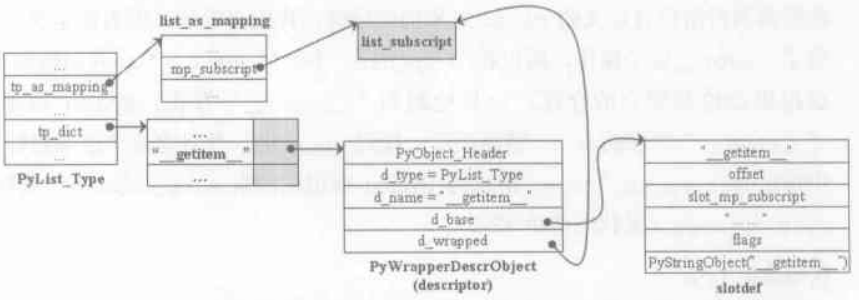 Python内部的各种descriptor都将包含PyDescr_COMMON,其中的d_type被设置为PyDescr_NewWrapper的参数type,而d_wrapped则存放着最重要的信息:操作对应的函数指针,比如对于PyList_Type来说,其tp_dict["__getitem__"].d_wrapped就是&mp_subscript。而slot则被存放在了d_base中