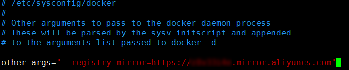 - 配置本机运行Docker 运行镜像加速器 vim /etc/sysconfig/docker,将获得的自己账户下的阿里云加速地址配置进 other_args="--registry-mirror= https://xxxx.mirror.aliyuncs.com"