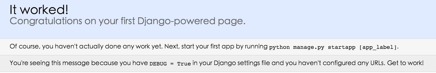 这样我们的django就启动起来了!当我们访问:http://127.0.0.1:8080/时就可以看到: