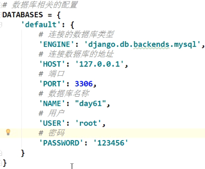 # 数据库相关的配置 DATABASES = { 'default': { 'ENGINE': 'django.db.backends.mysql', # 连接的数据库类型 'HOST': '127.0.0.1', # 连接数据库的地址 'PORT': 3306, # 端口 'NAME': "day61", # 数据库名称 'USER': 'root', # 用户 'PASSWORD': '123456' # 密码 } }'''