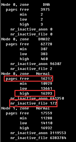 有大量的文件页cache,为什么会出现file+free<=high的情况,分析下来全备文件缓存时,node 0的nr_inactive_file很低,大部分非活动的文件页都分布在node 1上,是由于开启NUMA导致的。