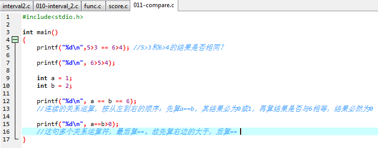 优先级:较低。比算术低,比赋值高 判断是否相等的==和!=比其他比较运算符低 5>3 == 6>4 : 连续的关系运算是从左到右的 6>5>4: 0