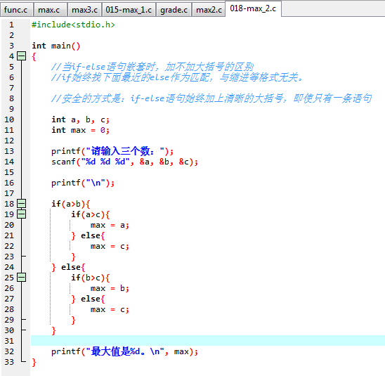 7-三数最大值:if-else嵌套时,不加大括号则if会找下面最近的else匹配,与缩进格式无关。