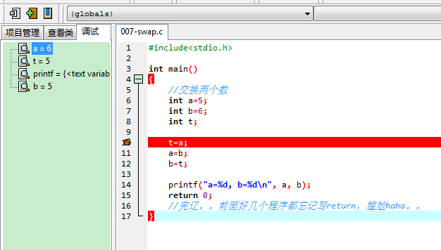 设置断点运行,停下来的地方是当前命令尚未执行的状态,按下一步才执行并跳转下一步 鼠标光标扫过的变量,可以从左侧栏看到当前状态下此变量的值。