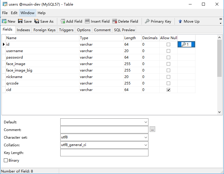 我们不会去使用自增长的id,在现阶段的互联网开发过程中,自增长的id是已经不适用了。在未来随着系统版本的迭代,用户数量的递增,肯定会做分库分表,去做一些相应的切分。在这个时候我们就需要有一个唯一的id。项目里面会有一个唯一id的插件去使用。所有的主键id都会使用一个字符串varchar。小头像是预览过程中会使用到的。聊天页面使用的是小头像。qrcode是扫码的。cid是client id,它是针对我们每一台手机设备,每一台手机设备都会有一个唯一的cid,这个cid可以通过plus(设备的H5+)相应的API去获取,获取之后cid会用于做消息的推送。