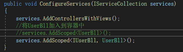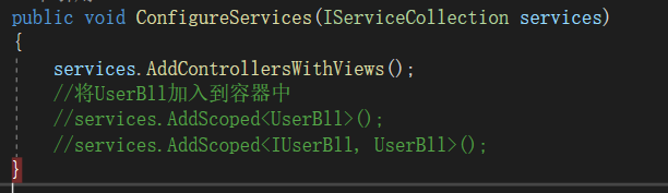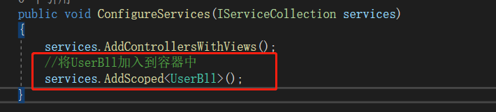 1. 在Web项目中找Startup.cs 文件, 打开文件,在方法ConfigureServices中将对应类型注入到容器中,如下: