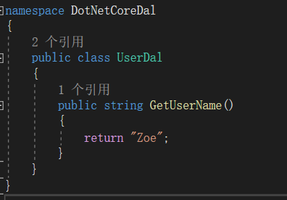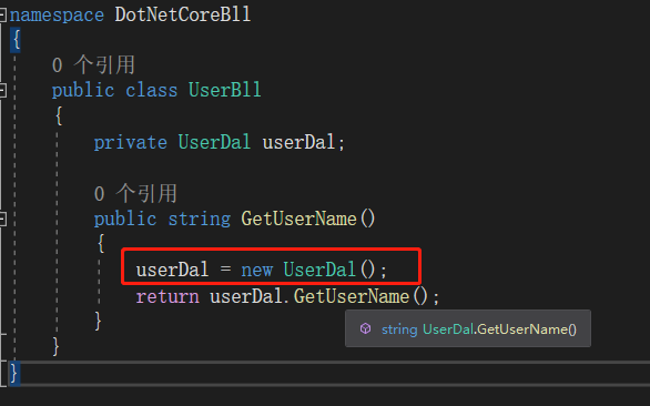 1. 分别在DotNetCoreBll 和 DotNetCoreDal中增加 类 UserBll 和 UserDal , 里面代码如下:
