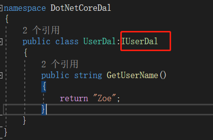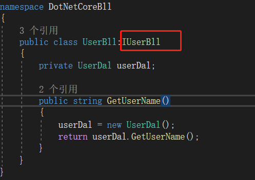 将原来的UserBll和UserDal分别继承IUserBll和IUserDal,如下:
