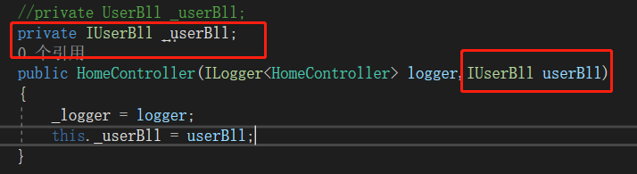 2. 在调用控制器构造函数中进行注入, 这里是在HomeController中,如下: